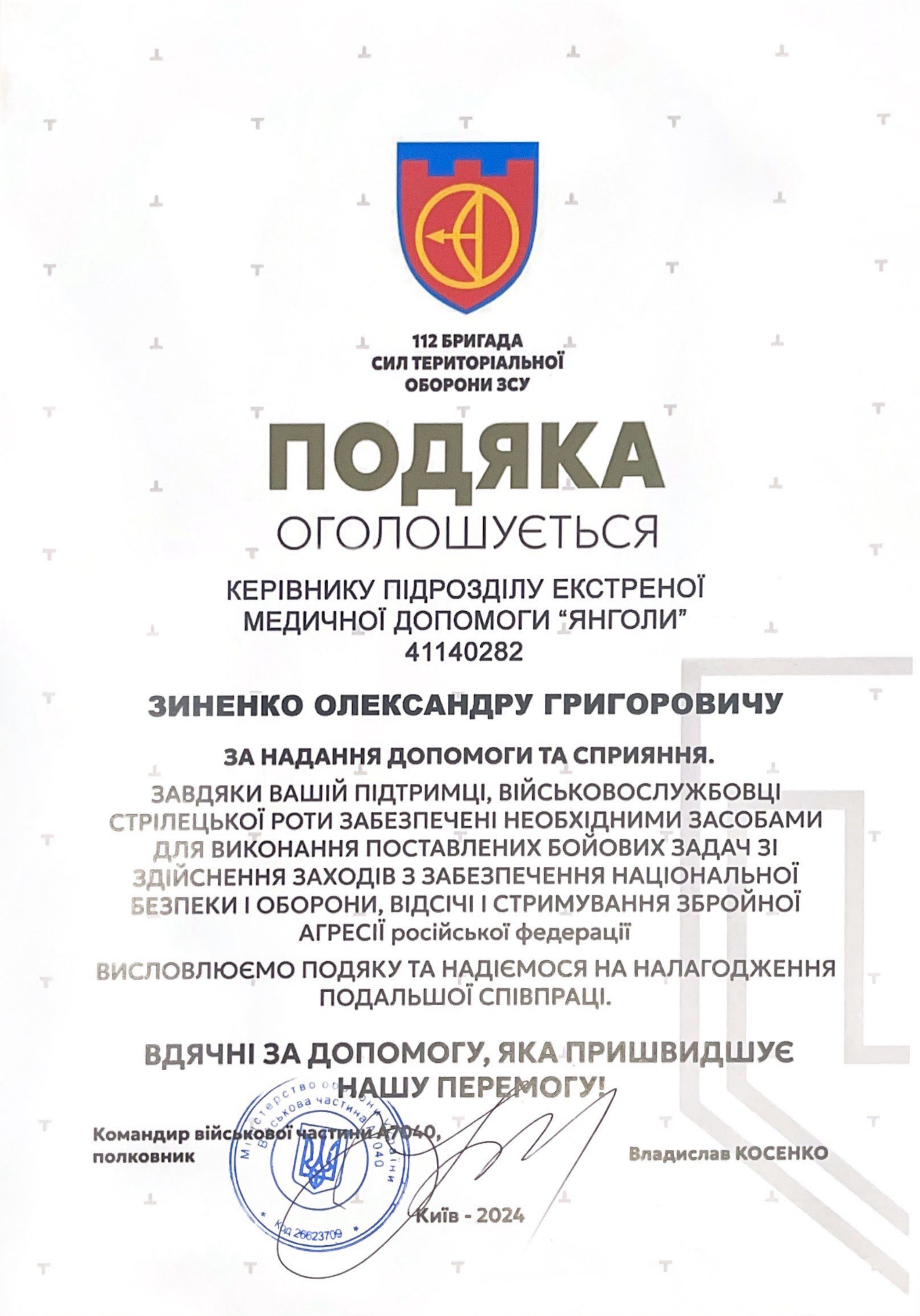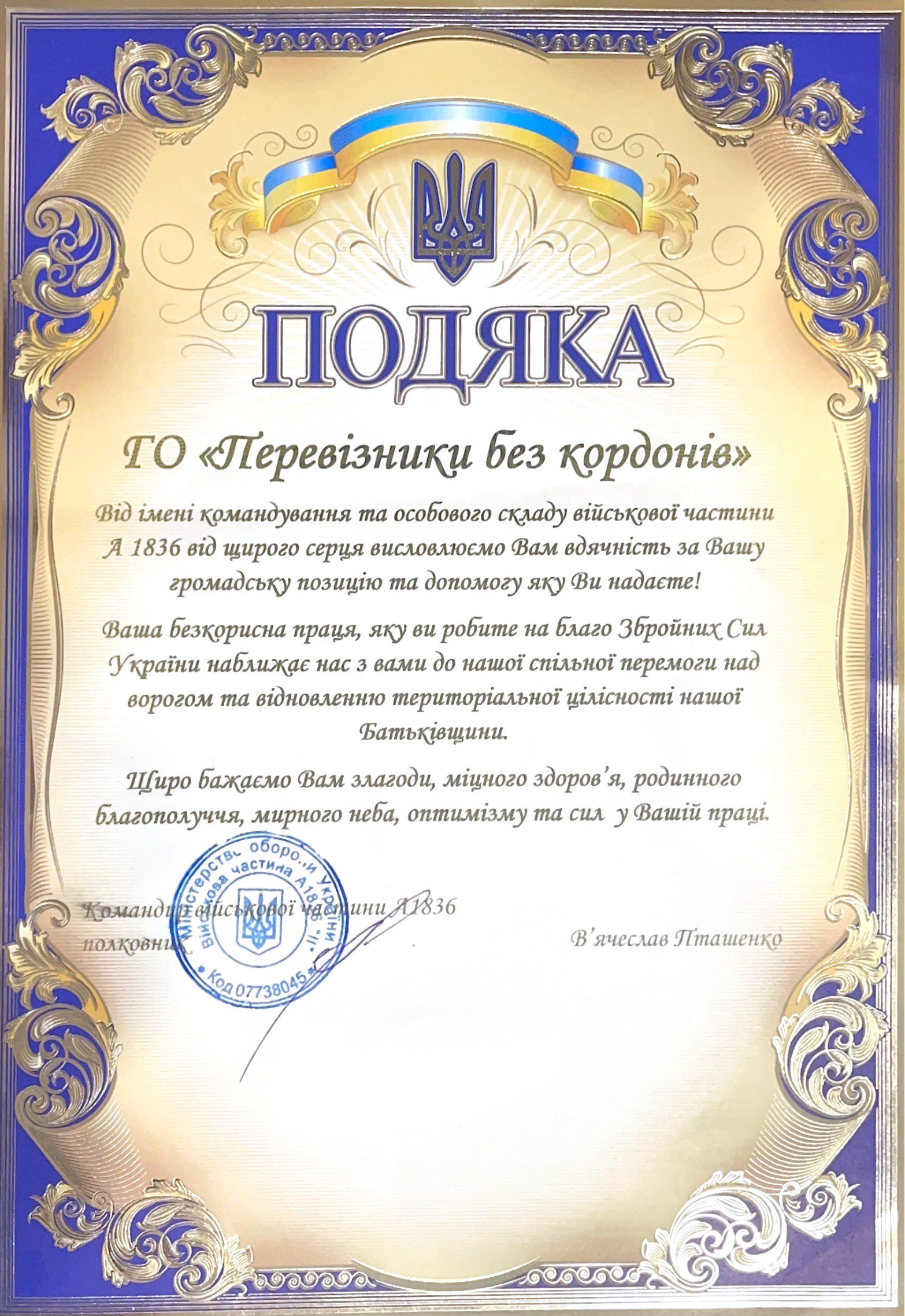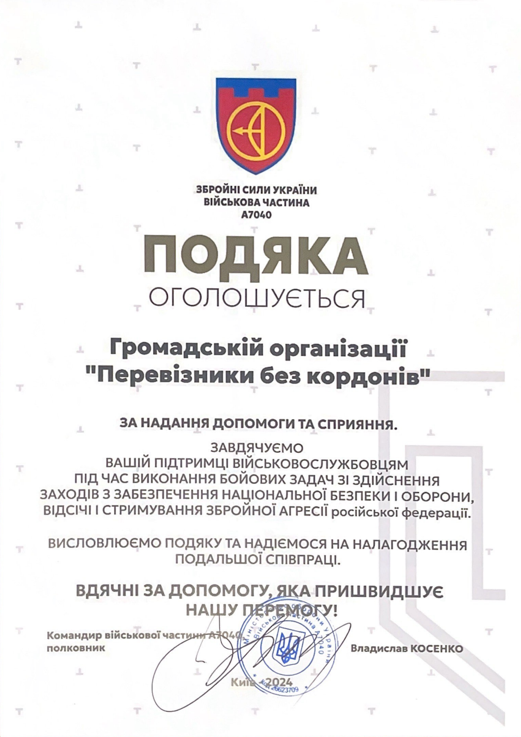 Тут ви знайдете наші подяки та сертифікати про співпрацю з різними організаціями та установами. Кожен із них відображає нашу спільну роботу та внесок у допомогу військовим і цивільним.
